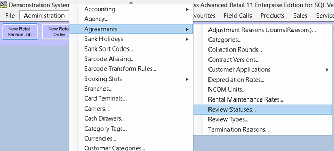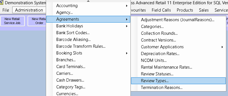 To set up agreement review types, navigate to the administration menu: Administration > Agreements > Review Types