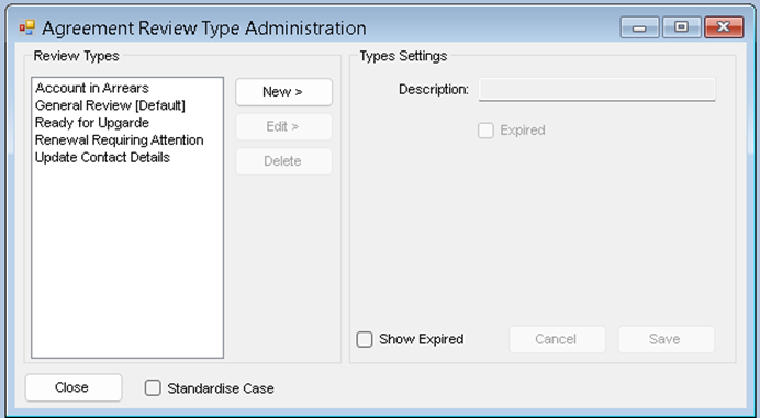 - Highlight the entry and click ‘Delete’ (only available if the review type has not been used).