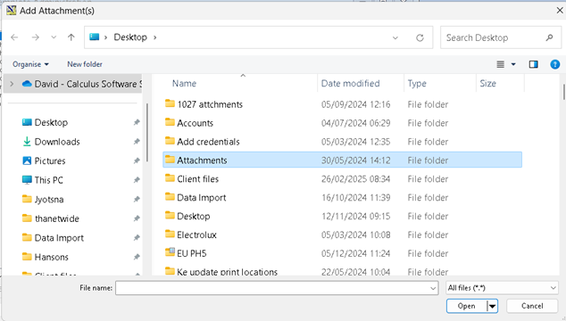 Browse to your file attachment. You can use the normal Windows browsing and selection, including highlighting multiple documents at once.