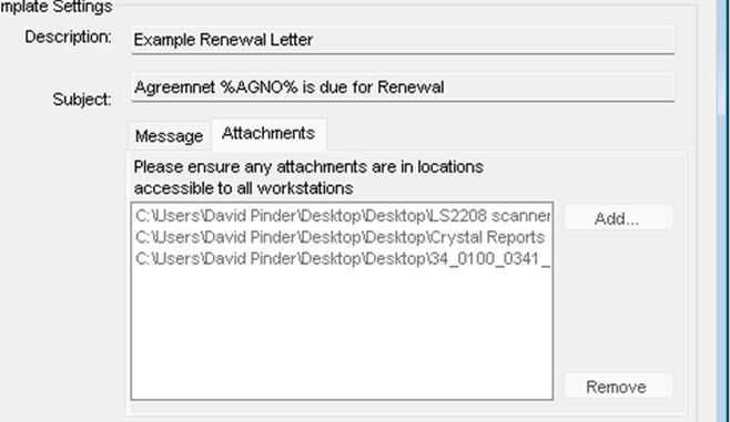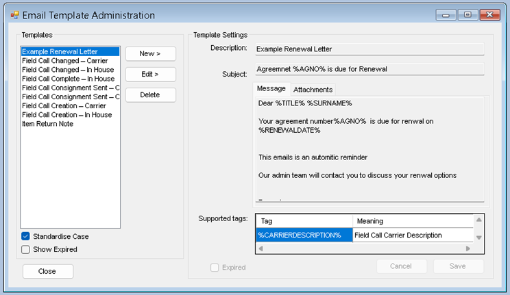 - You can add tags from the list. The tags insert customer or agreement information when the email is sent. The list of tags now includes %RENEWALDATE% and %AGNO%