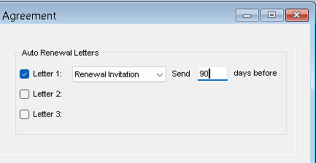 - The renewal letters are sent as emails from the system's email template system and must be set up in advance of adding the letter to the agreement.
