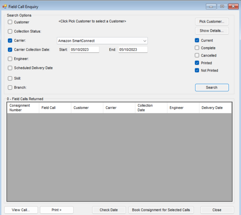 Go to Field Calls > Field Call Enquiry, you’ll be presented with the below screen: