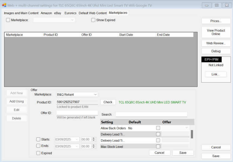 If B&Q is selected it will auto populate the Product ID using EAN - You can press "Check" to see if this is a B&Q catalogue product (This checks with B&Q to see if its an available product in the existing catalogue)