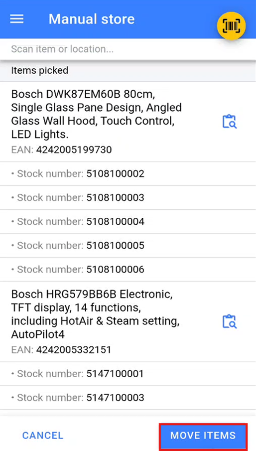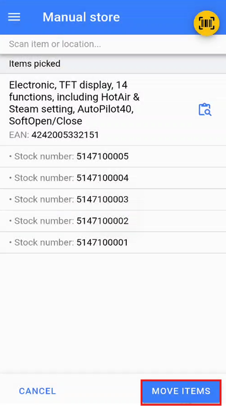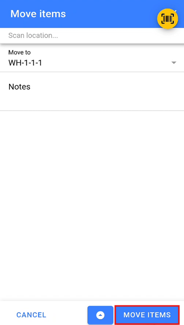 Once all required items have been scanned, click the Move Items button to confirm the selection.