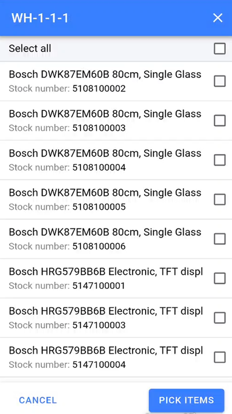 Once you have selected all items you wish to move, click the Pick Items button to confirm the products you are removing from this stock location.