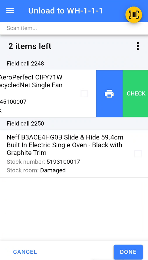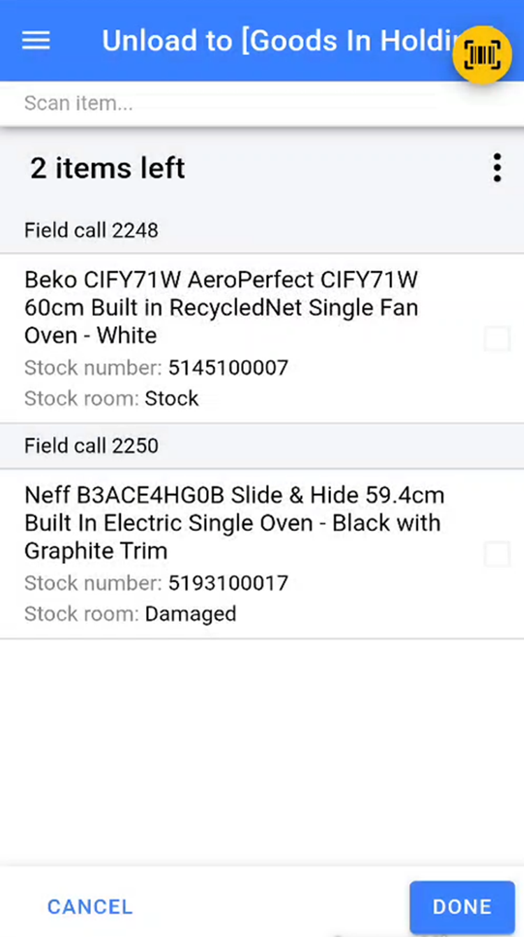 Once all items have been scanned or marked as scanned, click Done to complete the unload van process.