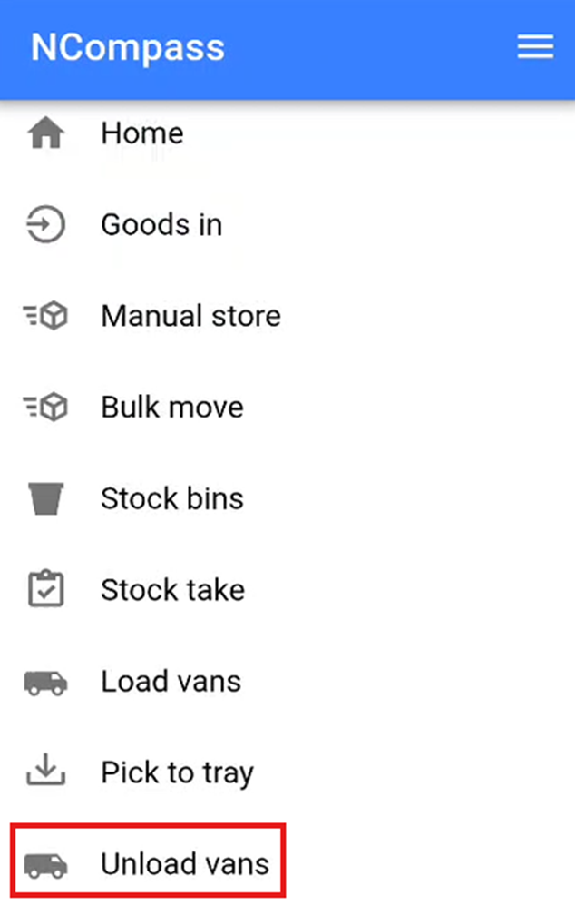This will open the Unload Vans screen.