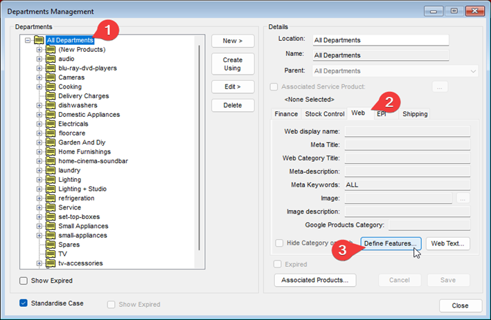 Select the top category known as All Departments > open the Web tab from the right hand side menu, and select Define Features in that section of the menu.