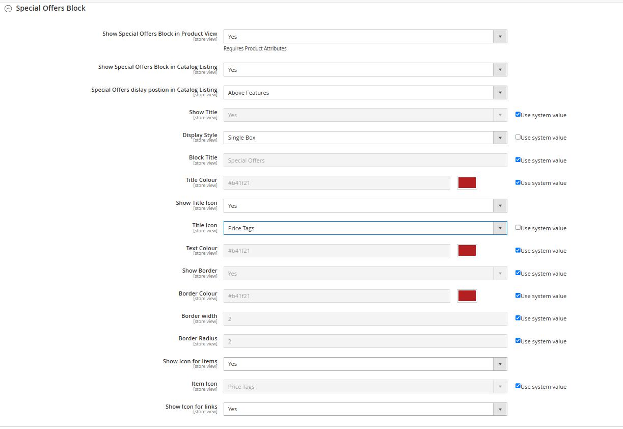 This configuration panel allows you to control the appearance and behaviour of the Special Offers Block on product and catalogue pages.