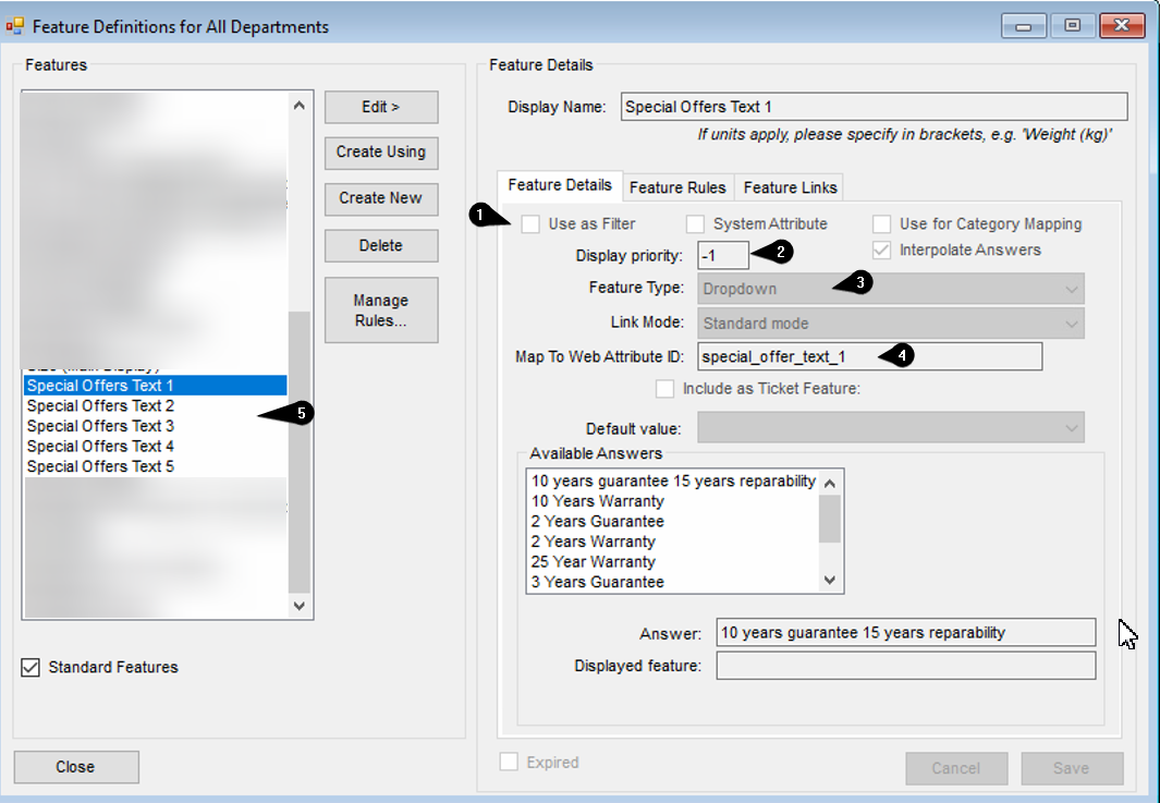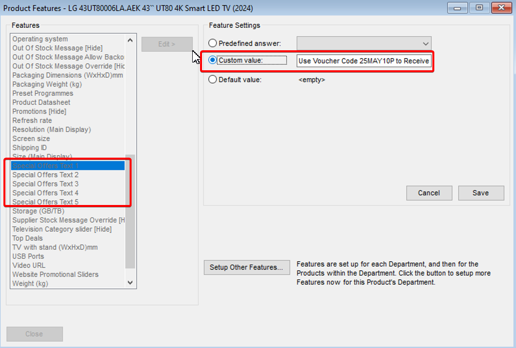 From the list of features available to you, find your special offer text features from the left hand menu, and select edit from the middle section of this window. You may either use Predefined answer, or custom value, populate the value with what you wish to display in your catalogue/product pages. You can see i've set a custom value here which allows me to write anything i'd like in this field. be sure to click save found in the bottom right of the window to set the feature.